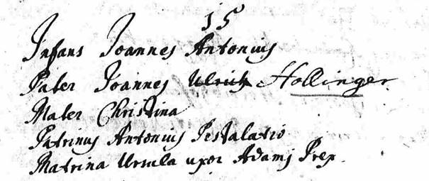 Johann Anton Hollinger, a bajorországi Neuburg an der Donauban született, Johann és Christina Hollinger második gyermekeként, 1702. szeptember 15-én. A családnak öt gyermeke volt, három fiú (Johann Anton, Johann Martin, Adam Jakob) és két leány (Maria Ursula, Maria Johanna).[1] Vélhetően a tanulmányait is itt kezdte és indult el a papi hivatás felé.