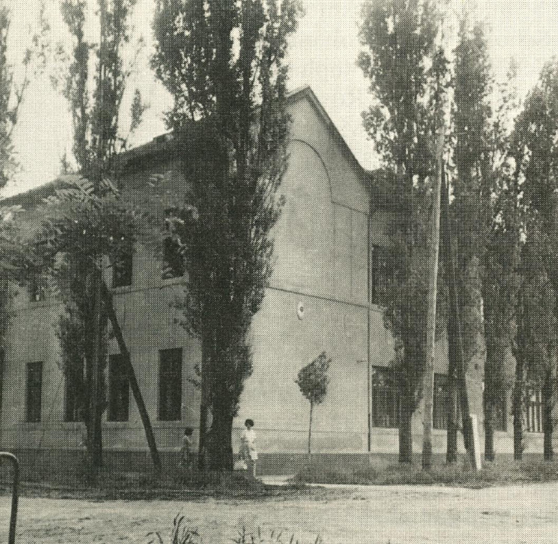 Ez egy kicsit újabb keletű kép az egykori polgári iskola épületéről, valószínűleg az 50-es évekből. Látható az ekkor már levert nagy koronás címer nyoma, alatta pedig a kis fehér ovális, Rákosi- vagy népköztársasági címeres iskolacímer, sajnos nem látszik eléggé. Már jó magasak a jellegzetes jegenyefák, amelyek manapság már jó ideje nincsenek ott – sajnos ki kellett vágni őket.