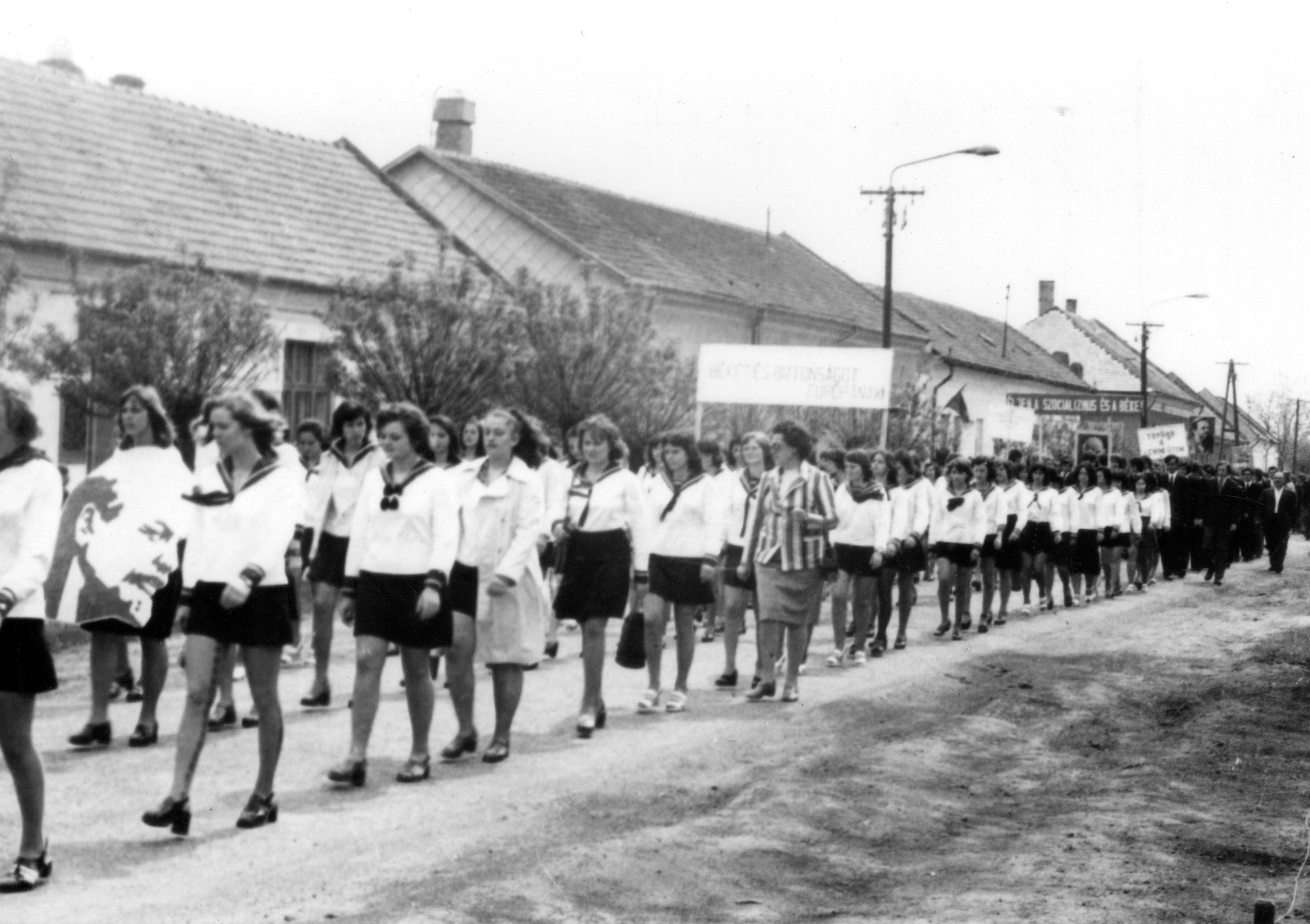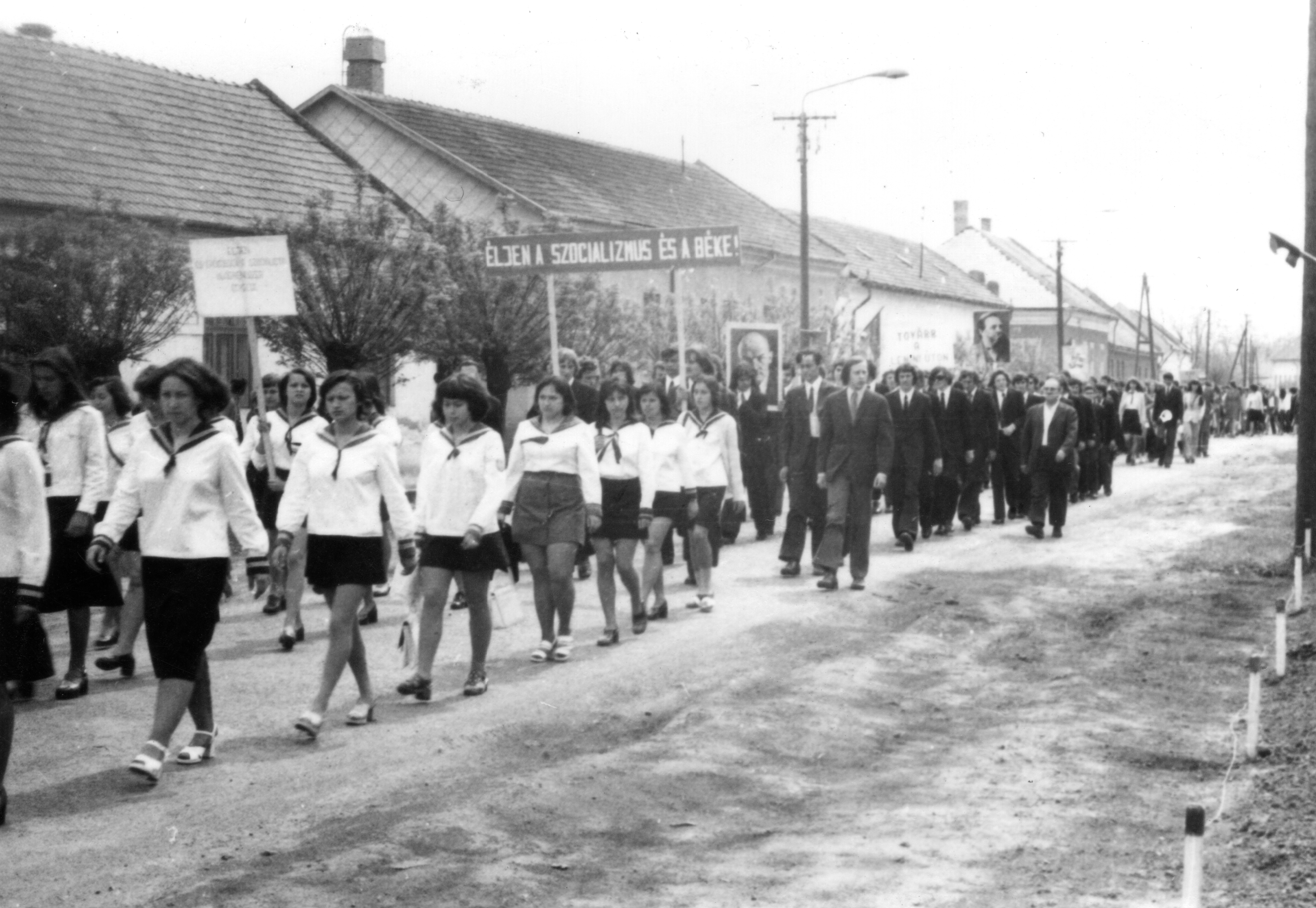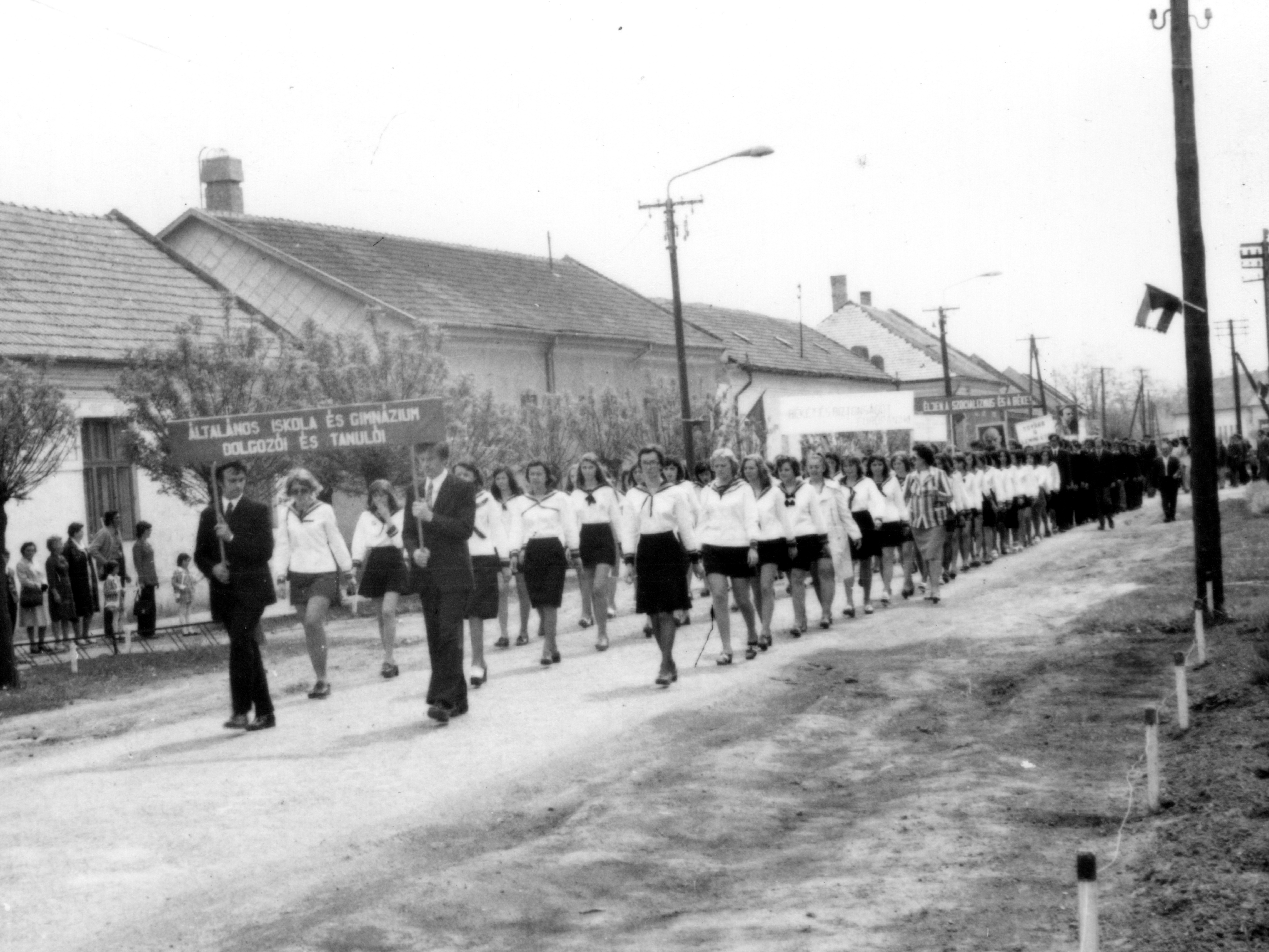 A következő képek az egykori pékség és a Zöldfa Étterem előtt vonulnak el a május elsejei felvonulásban részt vevő diákok – az eleki Általános Iskola és Gimnázium tanulói.