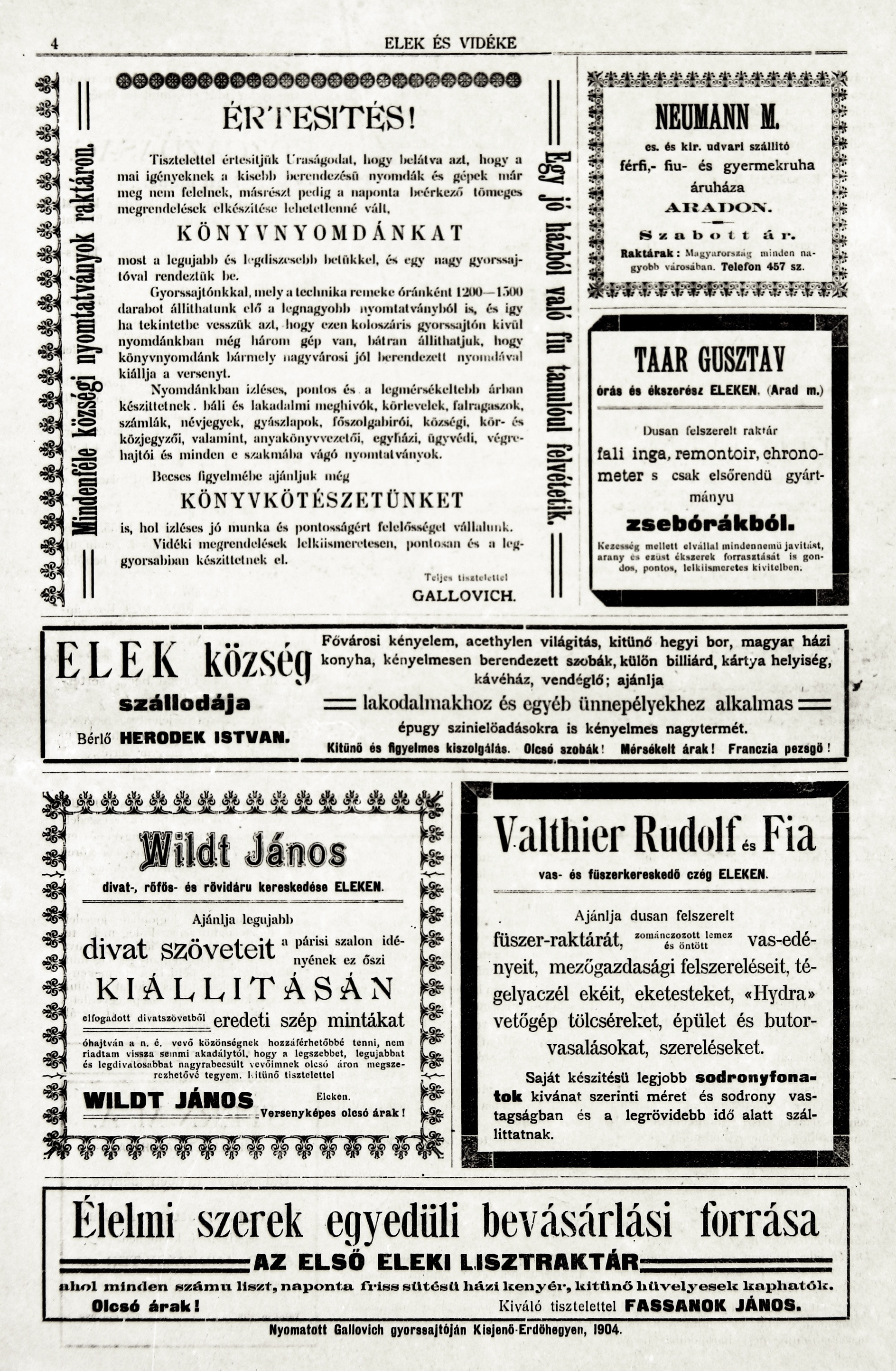 Az utolsó oldalon érhető legjobban tetten a “vidékiség”, hisz az eleki hirdetések mellett kisjenői és aradi hirdetéseket is találunk.