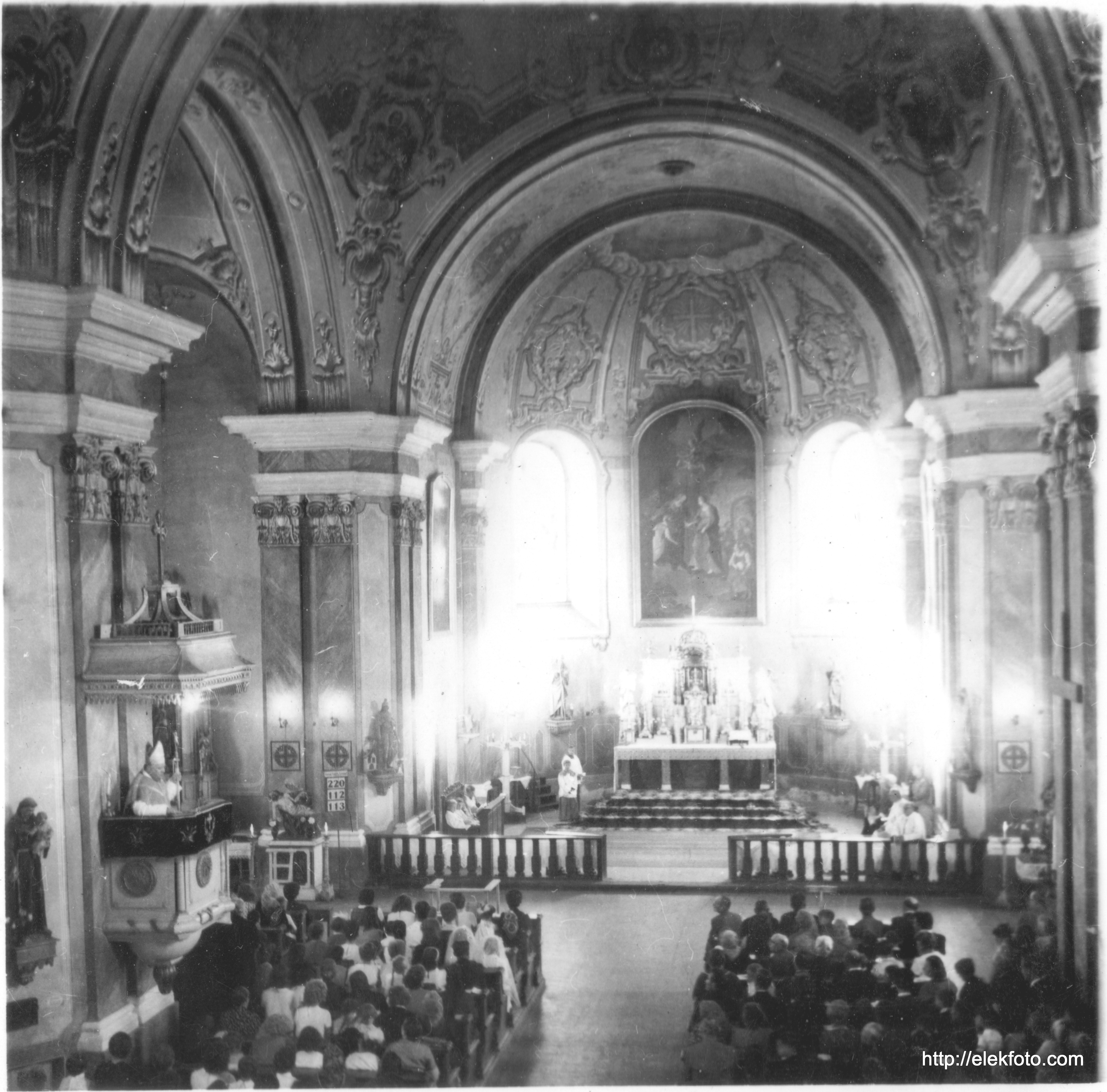 A felvétel valamikor az 1940-50-es években készülhetett, és jól látható, hogy még rendeltetésének megfelelően használták a szószéket, ami napjainkban már csak dísz, hiszen jó néhány éve az oltár előtti emelvényen miséznek. A szószéken éppen egy püspök beszél, a helyi plébános alighanem jobbra elöl ül a székén.