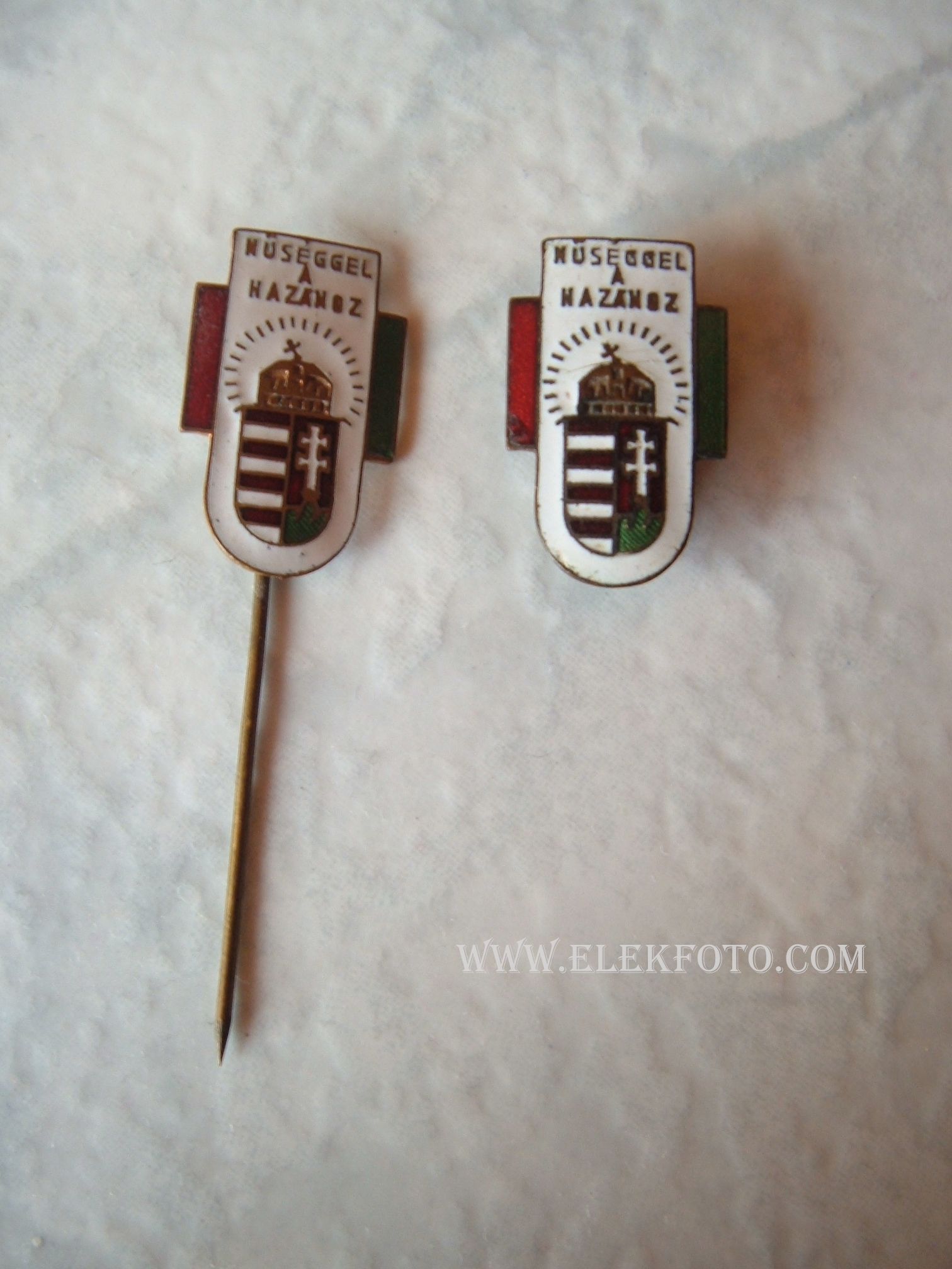 Korábban Mester Klára bejegyzésében látható volt egy igazolvány amely a “Hűséggel a Hazához” mozgalom jelvényének viselésére jogosított fel. Most íme a mozgalom jelvénye. A “tűs” jelvényt kitűzőként használták, a másikat pedig gomblyukban hordták (gomblyuk-jelvény).