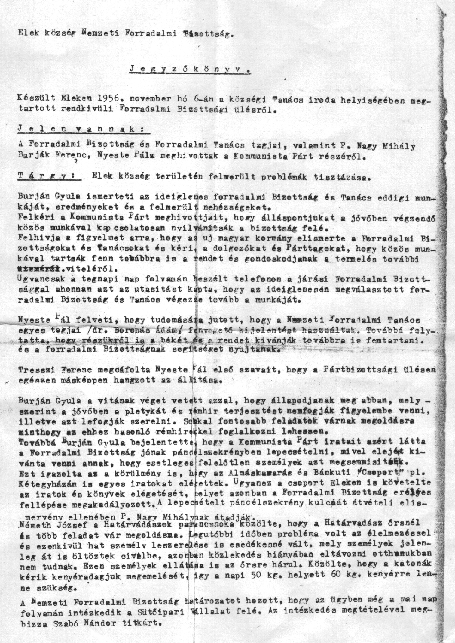 Most pedig térjünk vissza gondolatban az 1956. november 6-i Elekre, vagyis a forradalom leverése utáni második naphoz! Ekkor ülésezett a helyi Forradalmi Bizottság, a jegyzőkönyv szerint a következők voltak jelen: P. Nagy Mihály, Barják Ferenc és Nyeste Pál az MKP, valójában az MSzMP (azokat képviselte, akik leverték a forradalmat).