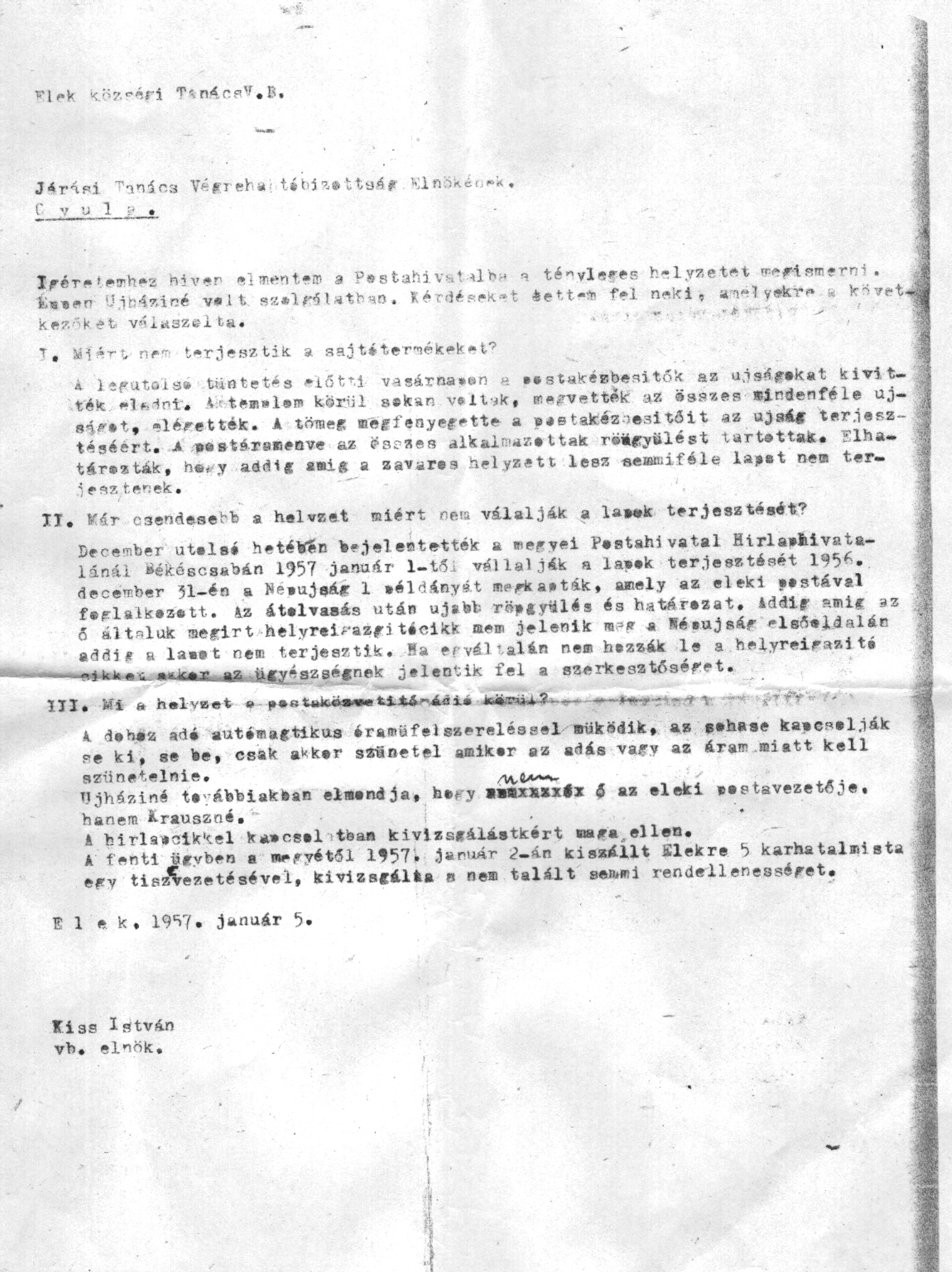 A következő, tulajdonunkba került, egy eleki hivatalos levél pedig 1957. január 5-én íródott, de ekkor már működött az eleki tanács, az elnök ekkor is Kiss István volt. Ebből a dokumentumból kiderül, hogy az eleki posta csak akkor terjesztette a lapokat, ha az akkori megyei újság elnézést kér a helyi postától azért, mert korábban igaztalanul vádolták meg a hivatalt. (Az újságégetés miatt 1957. január 2-án öt karhatalmista is “meglátogatta” Eleket, de ők sem találtak semmit!) Vagyis, még azokban a napokban is, több hónappal a forradalom leverése után is volt ellenállás Eleken, amit az akkori törvénytelen hatalom “természetesen” elfojtott.
