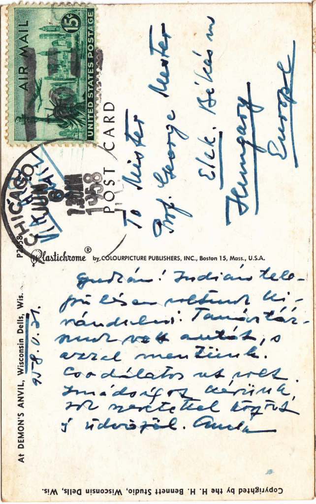 Wisconsin Dells 1958.máj. 31.  Gyurkám! Indián településen voltunk kirándulni. Tanár társunk vett autót, s azzal mentünk. Csodálatos ut csak(?) imádságot kérünk. Sok szeretettel köszönt és üdvözöl. Gyula