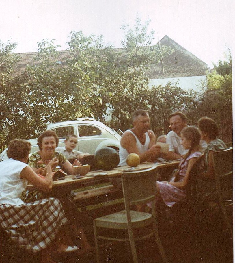 “Dinnye-evés 1963”- A kép bal szélén Ilona és Franziska Kaupert, a jobb oldalon Franz Post és Mester György