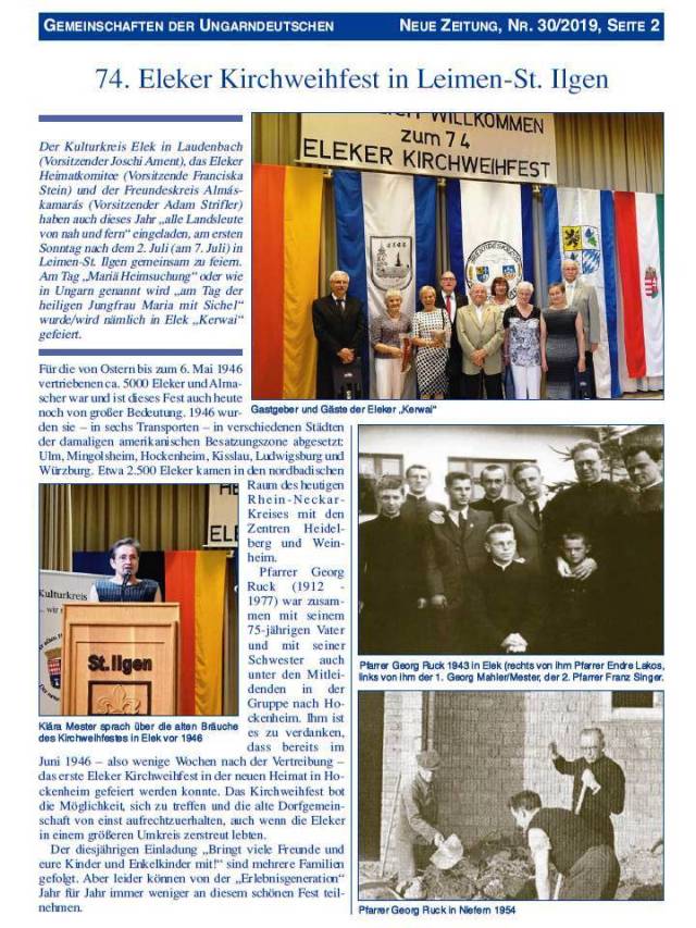 Amikor 2019 júliusában a Neue Zeitungban beszámoltunk az elekiek és almáskamrásiak 74. németországi búcsújáról, még nem sejtettük, hogy Leimen-St.Ilgenben ez volt az utolsó ilyen rendezvény.Az 1946. április -májusban a hazájukból elűzött eleki németek számára a templombúcsú megünneplése mindig fontos esemény volt, az első összejövetelre még ugyanebben az évben sor került.