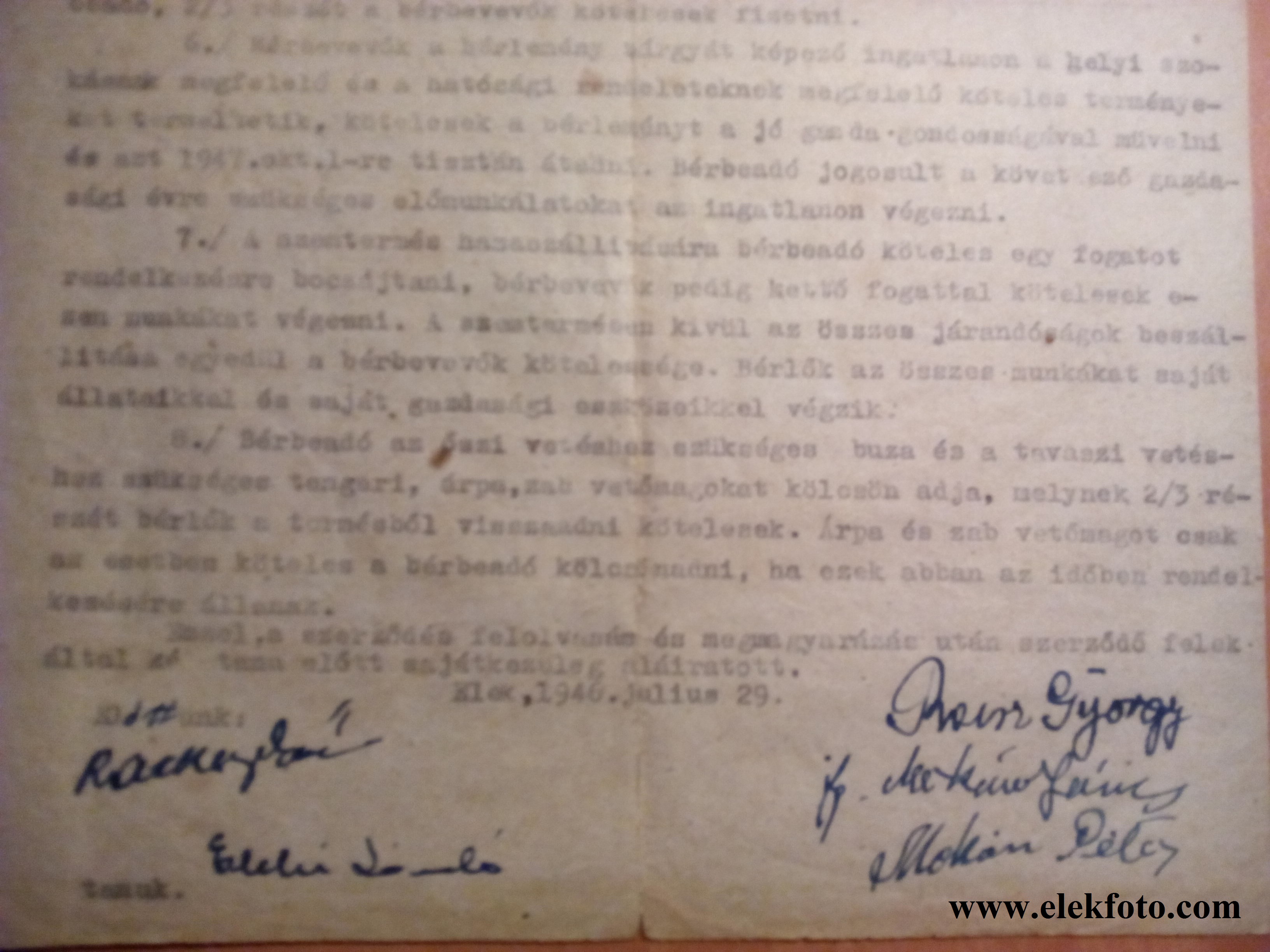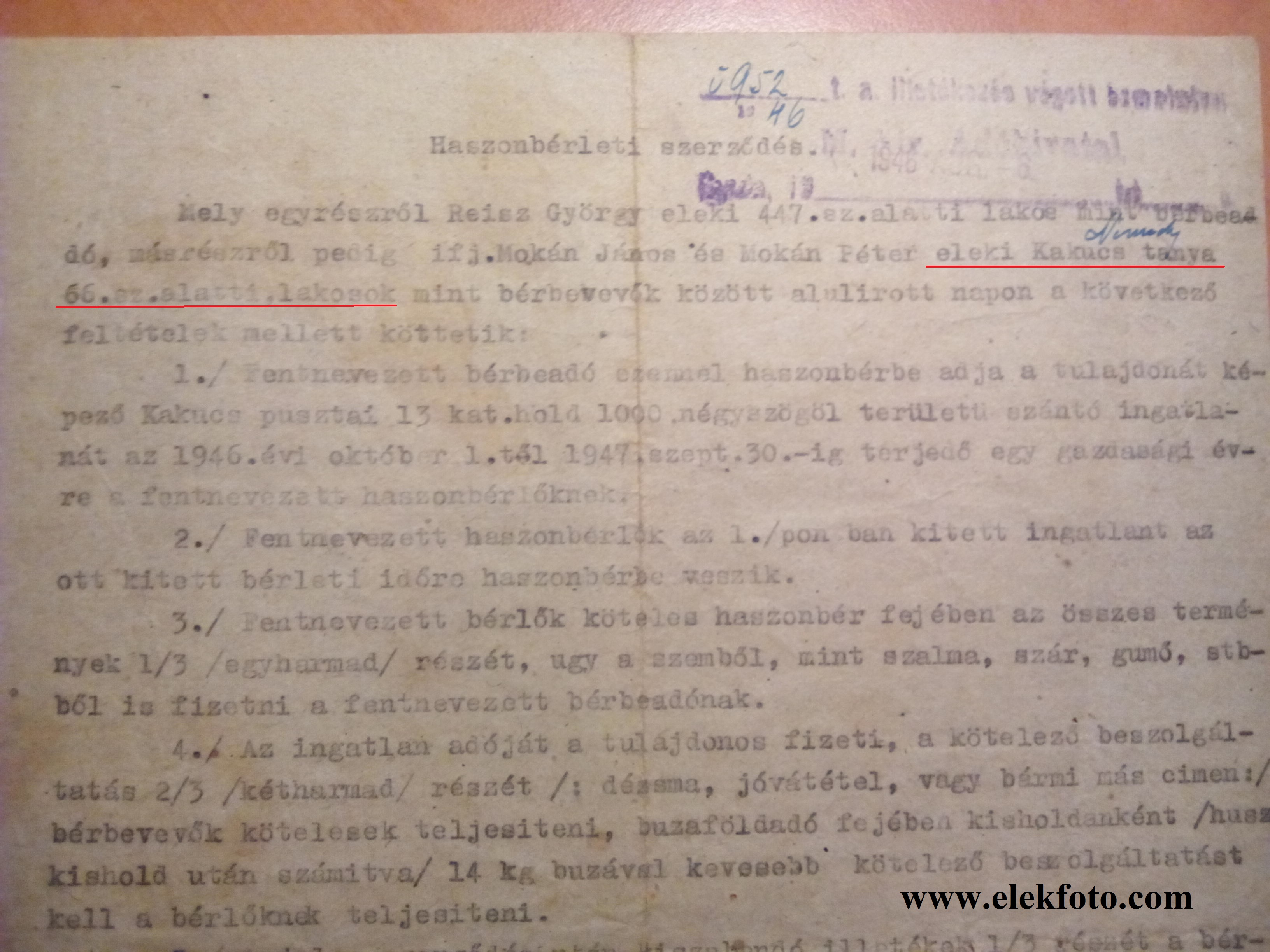 A másik okirat egy 1946-ból származó haszonbérleti szerződés. Itt Reisz György eleki tulajdonos adja bérbe a földterületét Mokán Péternek aki az eleki Kakucs tanya 66. szám alatt lakik. Tehát még 1946-ban is Elekhez tartozhatott közigazgatásilag ez a terület.