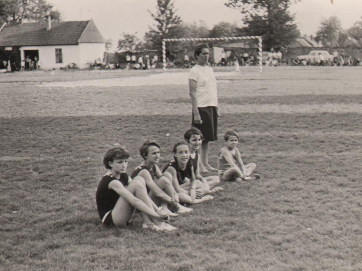 Focizó gimnazista lányok 1972-ben Eleken. Magda Erzsébet, Sztancsik Katalin a középső sorban