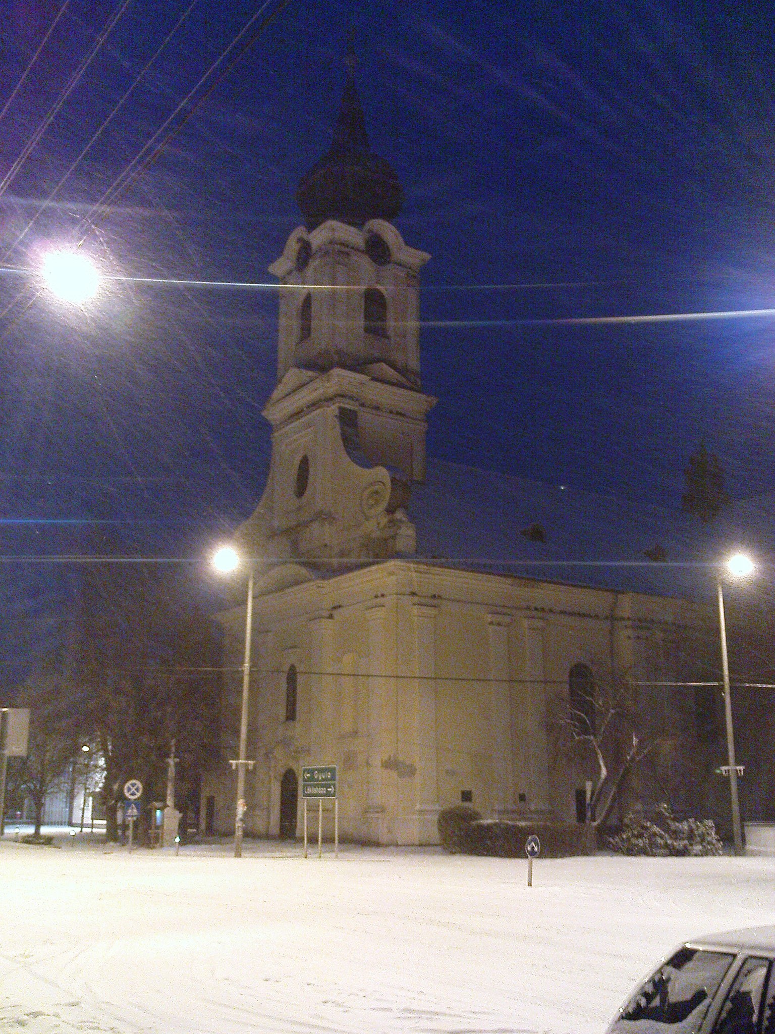 Az eleki római katolikus templom 2012. február 3-án este, havazásban