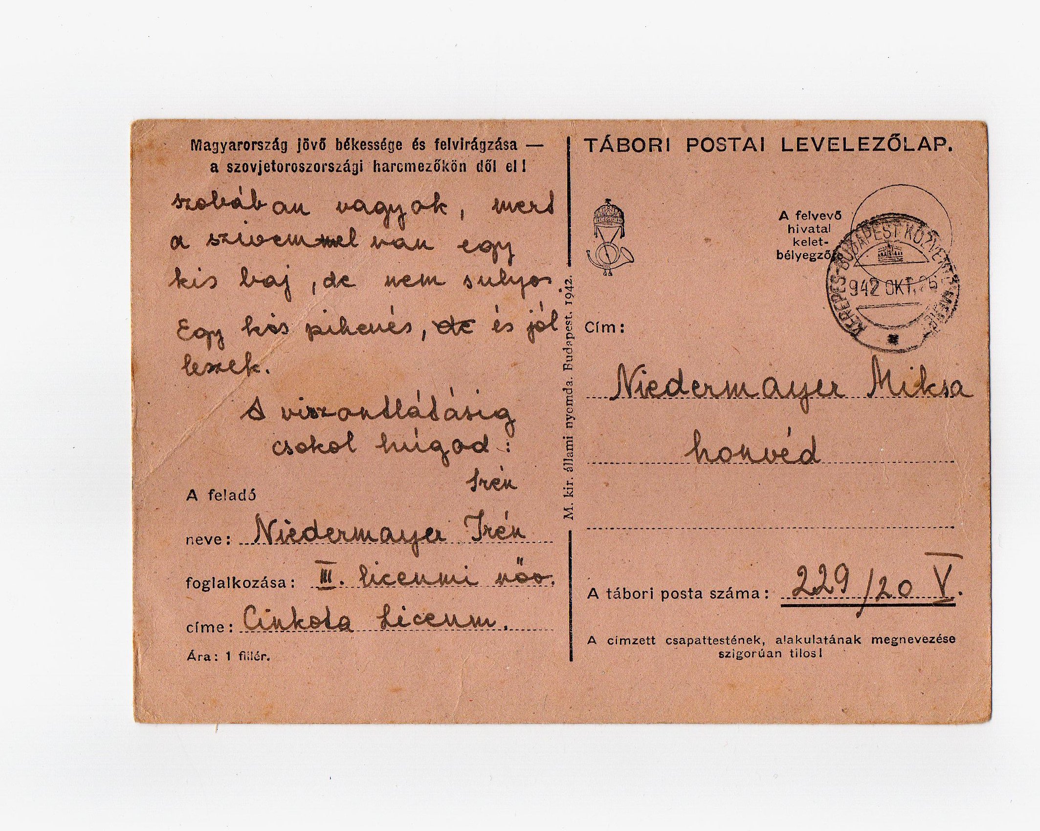 Édesanyja, Niedermayer Irén (később Müllek Antalné Nádor Irén) 1942. október 24-én tábori postai levelezőlapot írt testvérének, Niedermayer Miksának az orosz frontra.