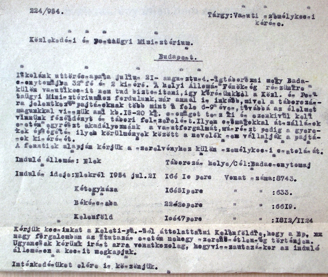 1951-ben Szilvásváradra például közel egy napig „vonatoztak” 4-5 átszállással. Az élményt még „színesebbé” tette, hogy központi utasításra az alapfelszerelést is magukkal kellett cipelniük: az ágyneműtől, takarótól, evőeszköztől kezdve a mosdótálon és levesmerő kanálon át egészen a seprűig! ( Utóbbiakból 10 gyerekenként 1db)