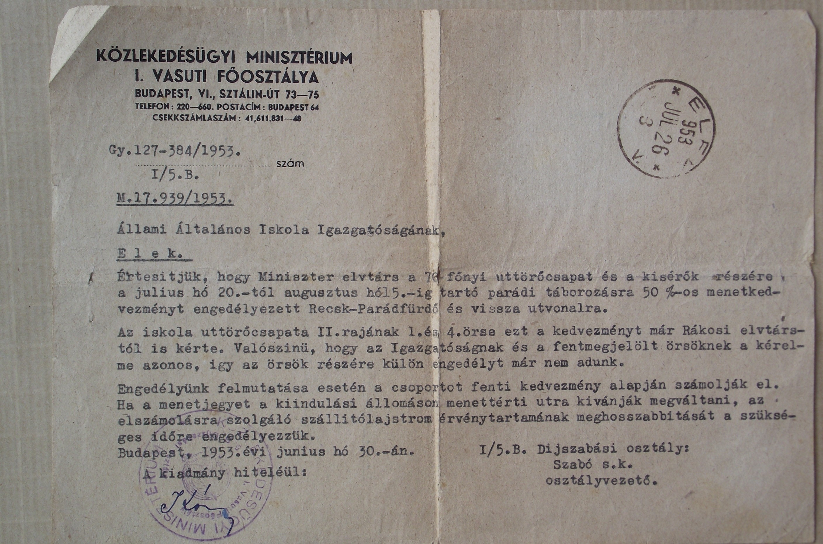 1953-ban Recsk-Parádfürdő, 1954-ben Badacsonytomaj volt az úti cél. Ekkor az utazás annyival vált kényelmesebbé, hogy engedélyek hosszan tartó beszerzése után külön vasúti kocsiba szállhattak Eleken a gyerekek, amit az útba eső állomásokon az iránynak megfelelő szerelvvényhez csatoltak.