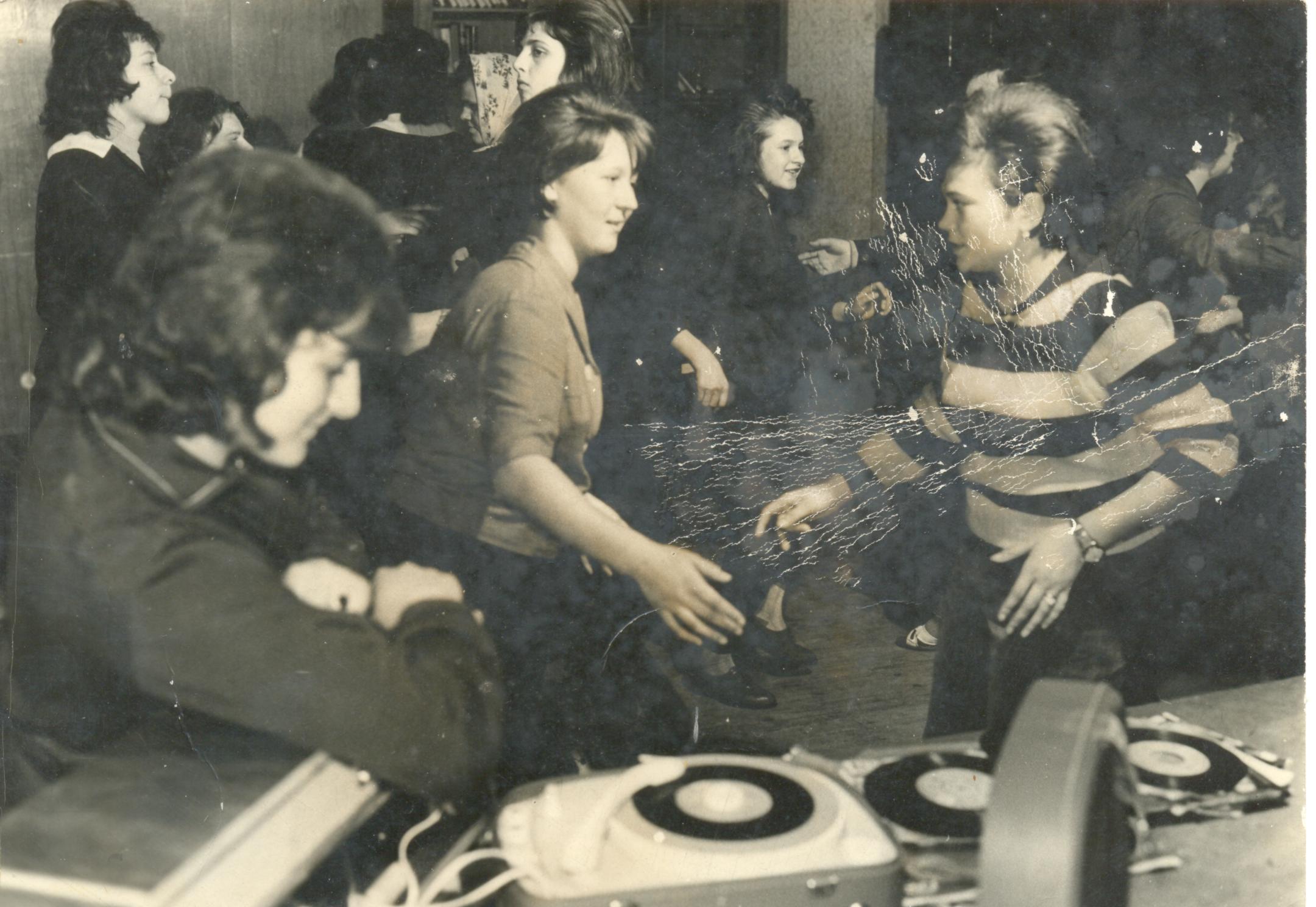 Ezen az  1964-ben készült,  enyhén rongálódott  fényképen valószínűleg I. és II. osztályosok táncolnak önfeledten egy korabeli slágerre. (Akkor még egy lemezjátszó is nagy kincsnek számított,  a lemezekről nem is beszélve!)