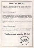 Ilyen volt a Fidesz-é is. A legfontosabb információk itt is a hátlapon szerepeltek. Itt olvashatól a később sikerre vezető szlogen is: “Hallgass a szívedre, szavazz a Fidesz-re!” Ezen már szerepel Orbán Viktor neve is, aki már 1989. október 23-án követelte a szovjet csapatok távozását hazánkból. Erre csak 1991 nyarán került sor.